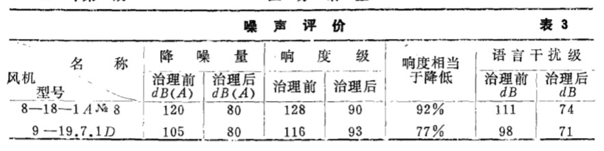 治理前 , 进风 机房 , 房 内根本 无法谈 话, 出机房伴有暂时耳聋。 治理 后, 室 内互相交 谈可 清 晰听 到, 无其他不 良感觉。 风机房外 , 噪声也 从95d B (A )降 到71d B (A )以下, 房外 已 感觉不 出 有风机 在运转。