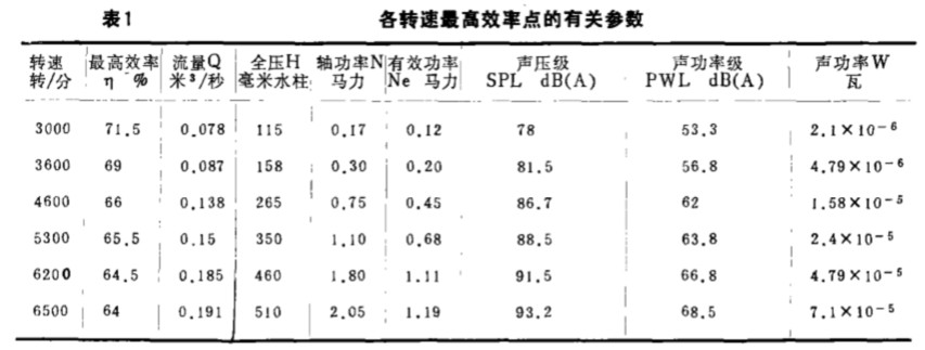 各转速下最 高效率的数值, 以及最高 效率点的流量 、 全压 、 轴功 率、 有 效 功 率 、 声压级 (A ) 、 声功 率级(A ) 、 声功率等有关参数如表 1所 示。