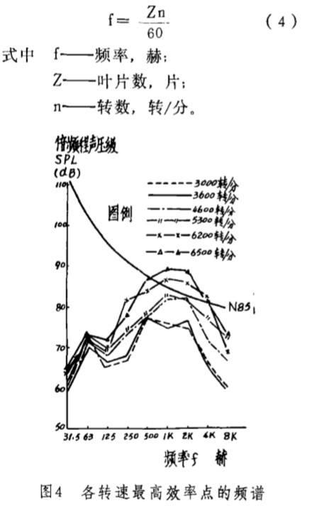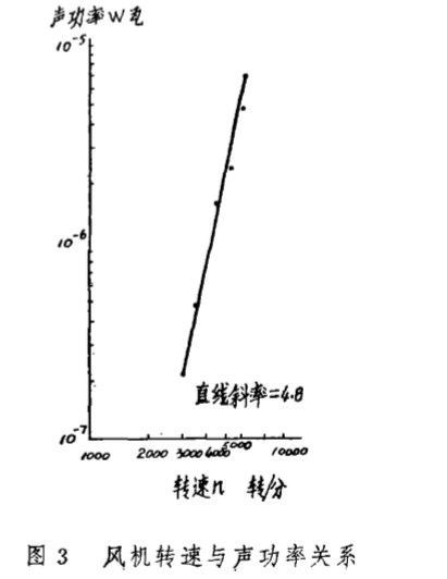 从式 ( 3) 可 以看出, 声功率是 转 速 4 . 8 次方 的函数 。 如转速增加 1倍 , 则声功率 将增加27 倍之 多 , 这是一个很 可观的数字 。